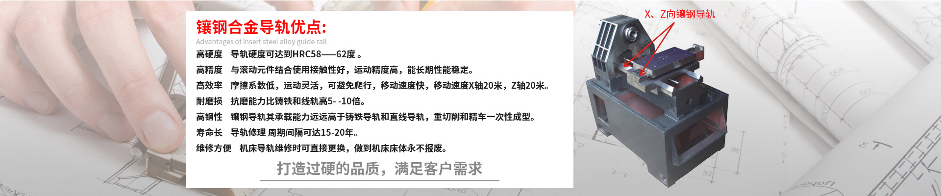 本公司創立于2002年,多年以來吸取國外數控機床先進技術的基礎上結合自身豐富的生產經驗,將原有的機床構造技術更上升了一個層次,更新了X,Z向均采用鑲鋼導軌的機床技術,使機床達到了高鋼性、高精度、率,高壽命、從而使機床經久耐用,床身*報廢,重切削和精車一次性完成的優點。本公司現生產有數控車床,車方機,雙頭車床,車銑復合機床,車銑鉆一體機床,伺服裝配壓機,本公司自身擁有完整的、先進的、精良的一條龍加工設備能確保生產出合格的、精良的機床,使客戶買的放心,用的舒心,創造更大的生產價值,使您獲得大的投資效果。同時我公司建有強有力的技術中心和售后服務體系,能為客戶提供產品開發,充計,制造,調試,售后一條龍的服務,我們衷心歡迎國內外廣大用戶垂詢,惠顧我公司產品,并真誠希望與各界朋友精誠合作。